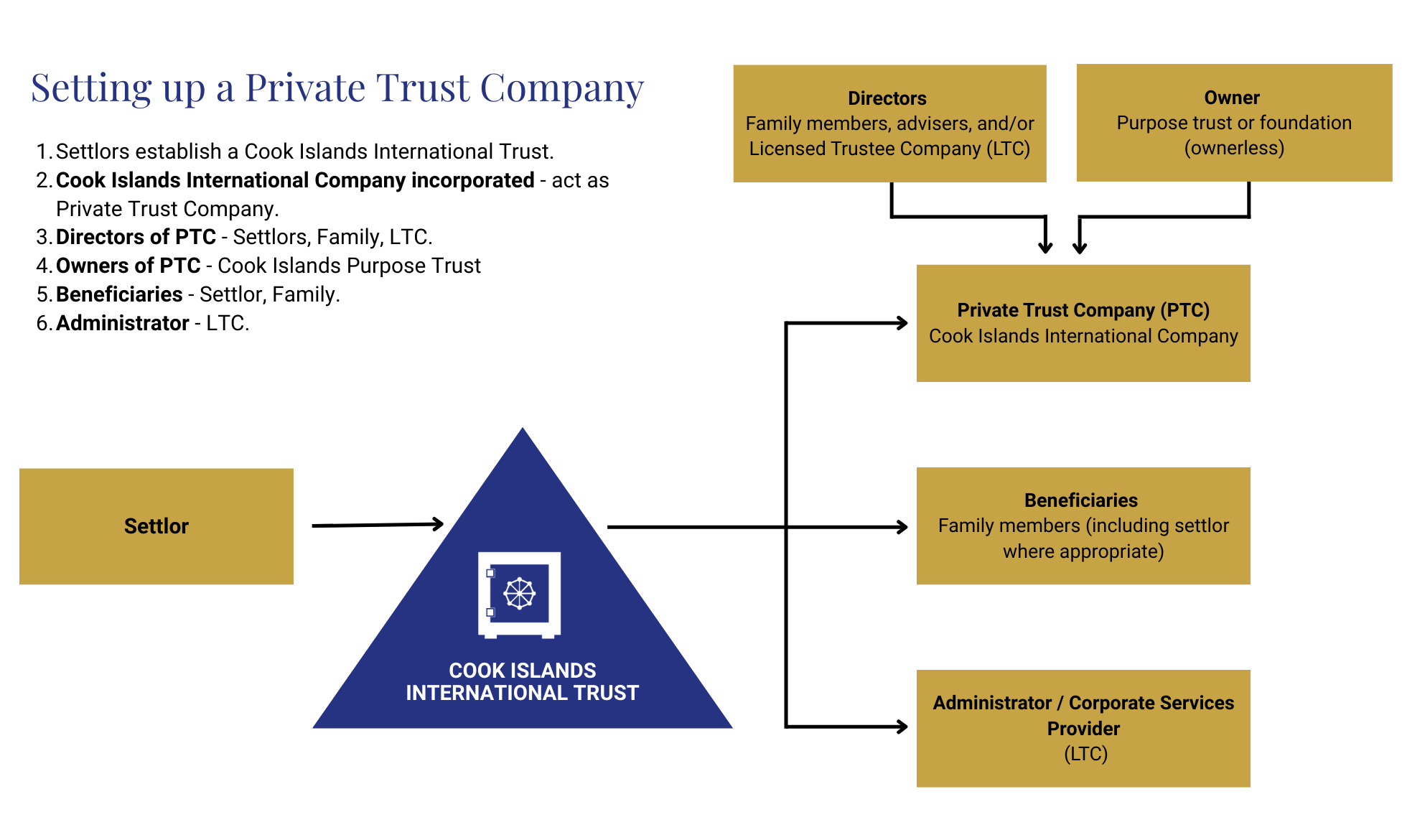 A Cook Islands LTC can provide a corporate director and administration services to the PTC to enable it to maintain its objectivity, meet statutory obligations and ensure trust activity is properly carried out and recorded.